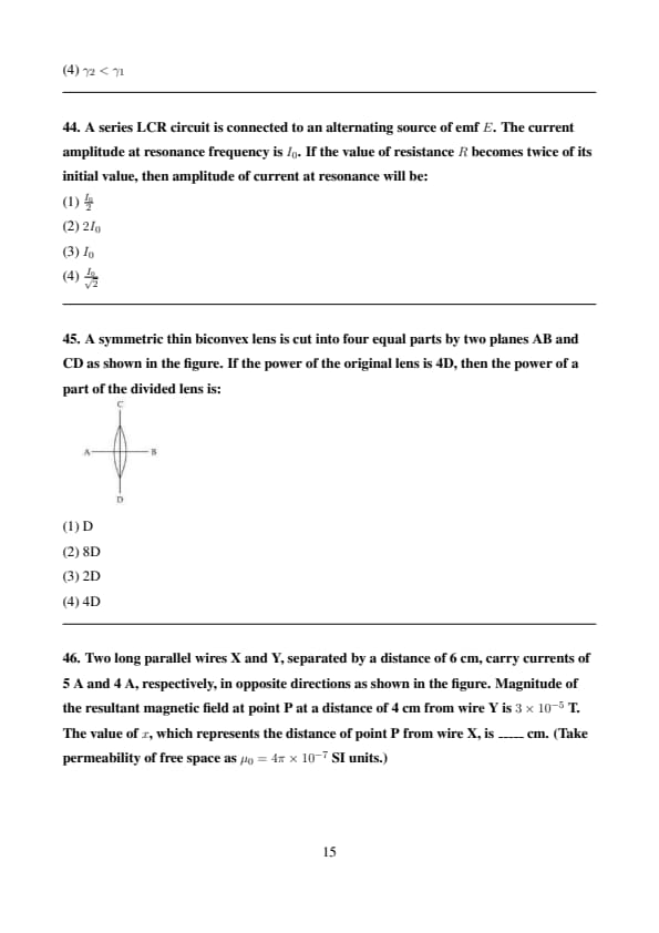 Two long parallel wires X and Y, separated by a distance of 6 cm, carry currents of 5 A and 4 A, respectively, in opposite directions as shown in the figure. Magnitude of the resultant magnetic field at point P at a distance of 4 cm from wire Y is \( 3 \times 10^{-5} \) T. The value of \( x \), which represents the distance of point P from wire X, is _____ cm. (Take permeability of free space as \( \mu_0 = 4\pi \times 10^{-7} \) SI units.)
