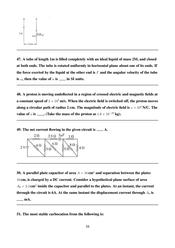 A tube of length 1m is filled completely with an ideal liquid of mass 2M, and closed at both ends. The tube is rotated uniformly in horizontal plane about one of its ends. If the force exerted by the liquid at the other end is \( F \) and the angular velocity of the tube is \( \omega \), then the value of \( \alpha \) is _____ in SI units.
