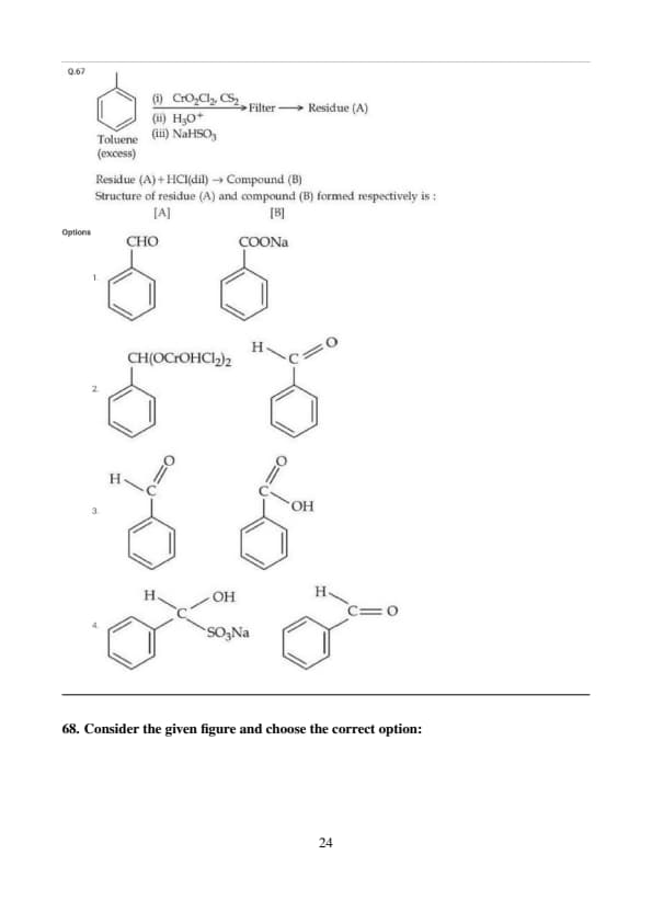 Step 1: The reaction involves the oxidation of toluene with \(\text{CrO}_2\text{Cl}_2\) and \(\text{CS}_2\). \(\text{CrO}_2\text{Cl}_2\) is a strong oxidizing agent, typically oxidizing the methyl group (\(\text{-CH}_3\)) in toluene to a carboxylic acid (\(\text{COOH}\)) group. This results in a formyl group (\(\text{CHO}\)) being left behind in residue (A), as toluene is partially oxidized. Step 2: The treatment with water and NaHSO\(_3\) ensures further oxidation of the formyl group (\(\text{CHO}\)) into a carboxyl group (\(\text{COOH}\)). Diluting with HCl gives a sodium salt of the carboxyl group (\(\text{COONa}\)) in compound (B). Thus, the structures of residue (A) and compound (B) are as follows: Residue (A) has a formyl group (\(\text{CHO}\)) and compound (B) has a carboxylate group (\(\text{COONa}\)). Quick Tip: When toluene is oxidized with chromium reagents like CrO\(_2\)Cl\(_2\), the methyl group is oxidized to a carboxyl group. Sodium bisulfite is often used to convert aldehydes to carboxylates.