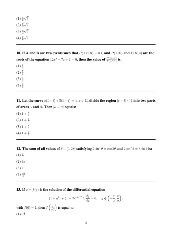 Let the curve \( z(1 + i) + \overline{z}(1 - i) = 4, \, z \in \mathbb{C} \), divide the region \( |z - 3| \leq 1 \) into two parts of areas \( \alpha \) and \( \beta \). Then \( |\alpha - \beta| \) equals: