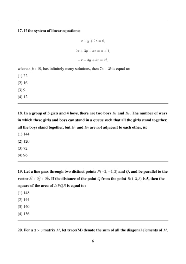 If the system of linear equations: \[ x + y + 2z = 6, \] \[ 2x + 3y + az = a + 1, \] \[ -x - 3y + bz = 2b, \] where \( a, b \in \mathbb{R} \), has infinitely many solutions, then \( 7a + 3b \) is equal to: