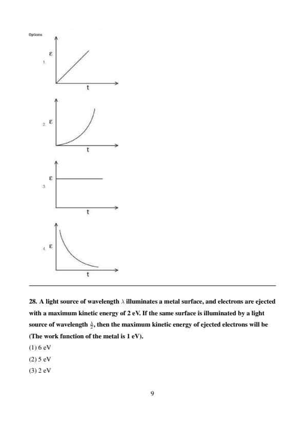 A light source of wavelength \( \lambda \) illuminates a metal surface, and electrons are ejected with a maximum kinetic energy of 2 eV. If the same surface is illuminated by a light source of wavelength \( \frac{\lambda}{2} \), then the maximum kinetic energy of ejected electrons will be (The work function of the metal is 1 eV).