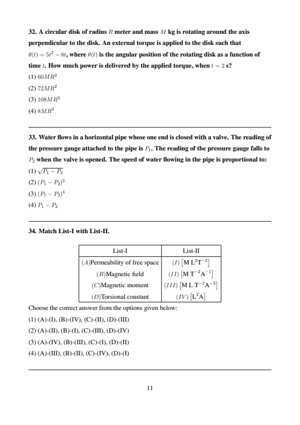 A circular disk of radius \( R \) meter and mass \( M \) kg is rotating around the axis perpendicular to the disk. An external torque is applied to the disk such that \( \theta(t) = 5t^2 - 8t \), where \( \theta(t) \) is the angular position of the rotating disk as a function of time \( t \). How much power is delivered by the applied torque, when \( t = 2 \) s?