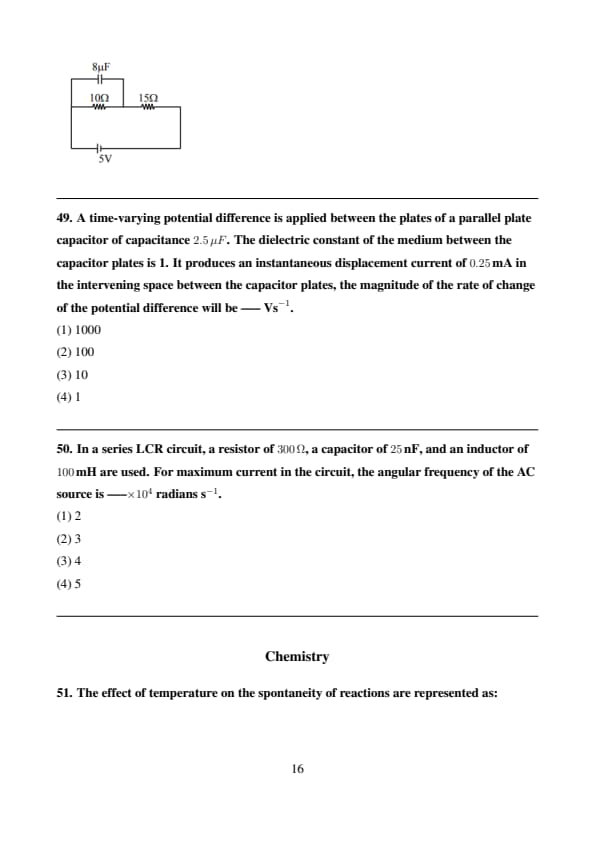 A time-varying potential difference is applied between the plates of a parallel plate capacitor of capacitance \( 2.5 \, \mu F \). The dielectric constant of the medium between the capacitor plates is 1. It produces an instantaneous displacement current of \( 0.25 \, mA \) in the intervening space between the capacitor plates, the magnitude of the rate of change of the potential difference will be ----- \( Vs^{-1} \).
