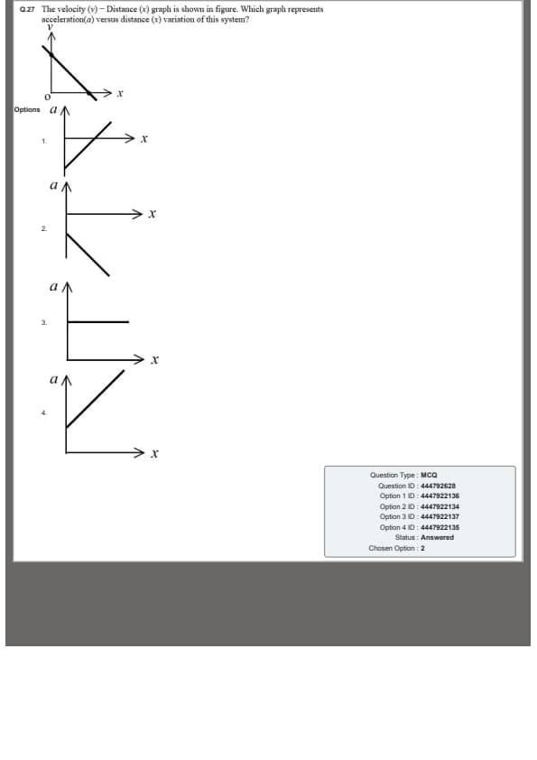 The velocity (\(v\)) – distance (\(x\)) graph is shown in the figure. Which graph represents acceleration (\(a\)) versus distance (\(x\)) variation of this system?