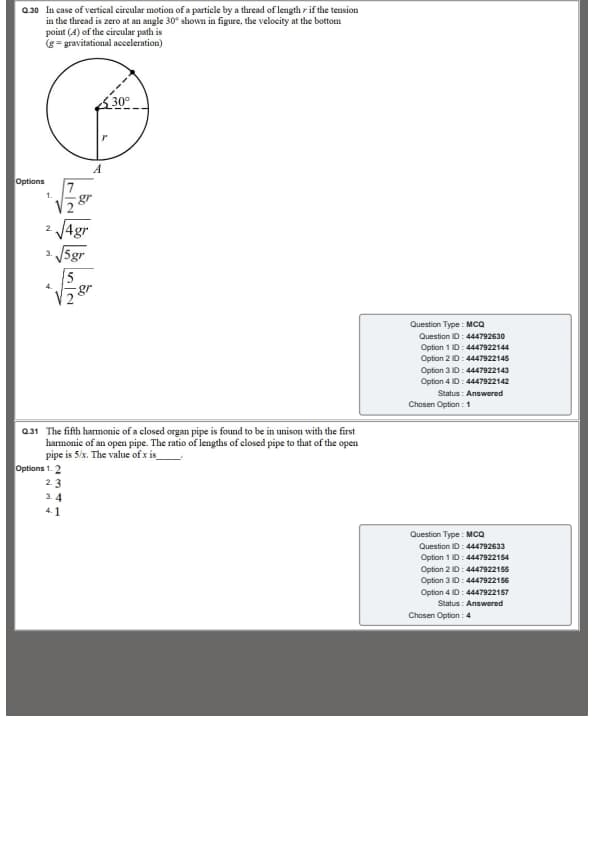 In case of vertical circular motion of a particle by a thread of length \( r \), if the tension in the thread is zero at an angle \(30^\circ\) as shown in the figure, the velocity at the bottom point (A) of the vertical circular path is ( \( g \) = gravitational acceleration ).