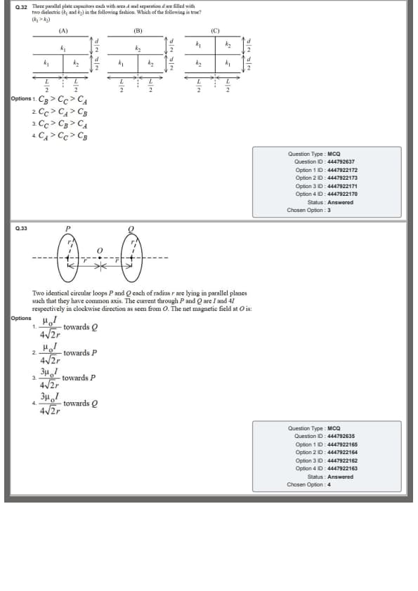 Three parallel plate capacitors each with area \(A\) and separation \(d\) are filled with two dielectric (\(k_1\) and \(k_2\)) in the following fashion. (\(k_1 > k_2\)) Which of the following is true?