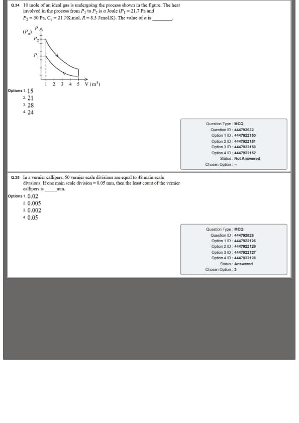 10 mole of an ideal gas is undergoing the process shown in the figure. The heat involved in the process from \(P_1\) to \(P_2\) is \( \alpha \) Joule \((P_1 = 21.7 Pa,\; P_2 = 30 Pa,\; C_v = 21 J/K·mol,\; R = 8.3 J/mol·K)\). The value of \( \alpha \) is ____.