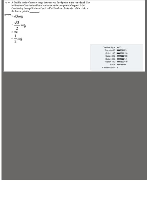 A flexible chain of mass \(m\) hangs between two fixed points at the same level. The inclination of the chain with the horizontal at the two points of support is \(30^\circ\). Considering the equilibrium of each half of the chain, the tension of the chain at the lowest point is ____.