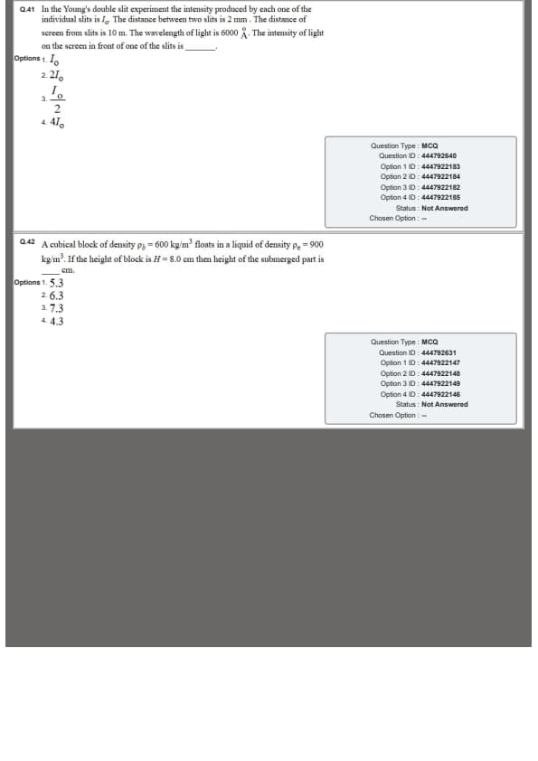 In the Young's double slit experiment the intensity produced by each one of the individual slits is \(I_0\). The distance between two slits is \(2\,mm\). The distance of screen from slits is \(10\,m\). The wavelength of light is \(6000\,\AA\). The intensity of light on the screen in front of one of the slits is ____.