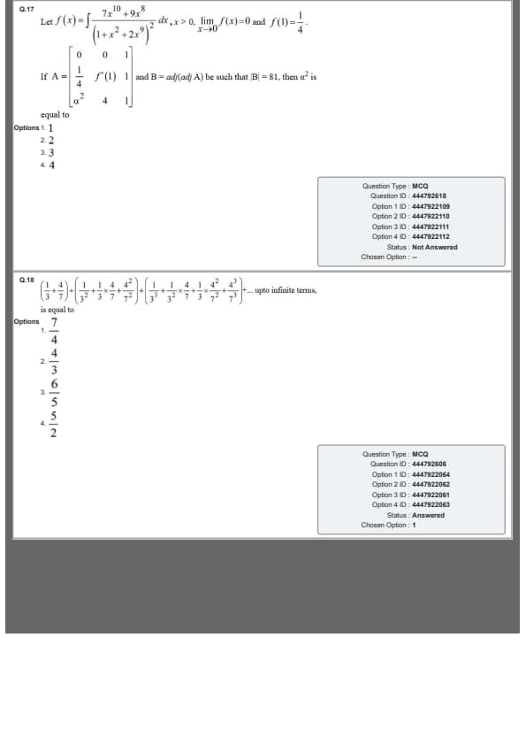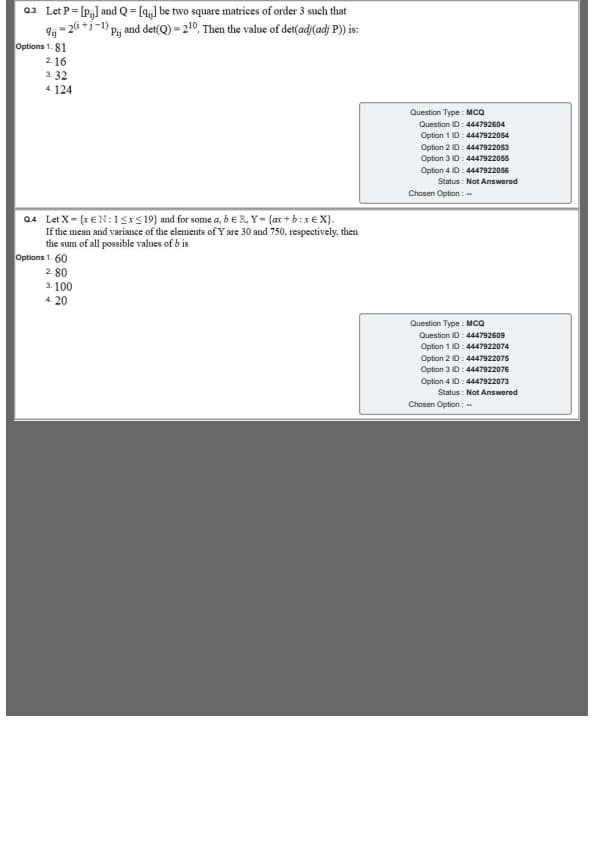 Let \(P=[p_{ij}]\) and \(Q=[q_{ij}]\) be two square matrices of order \(3\) such that \(q_{ij}=2^{(i+j-1)}p_{ij}\) and \(\det(Q)=2^{10}\). Then the value of \(\det(\operatorname{adj}(\operatorname{adj} P))\) is