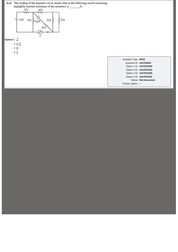 The reading of the ammeter (\(A\)) in steady state in the following circuit (assuming negligible internal resistance of the ammeter) is ____ A.