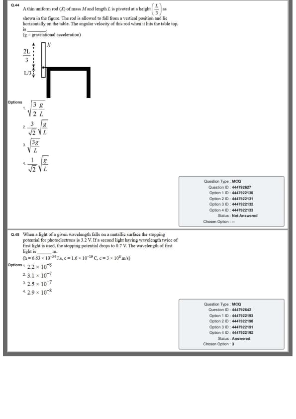 A thin uniform rod (\(X\)) of mass \(M\) and length \(L\) is pivoted at a height \( \left(\dfrac{L}{3}\right) \) as shown in the figure. The rod is allowed to fall from a vertical position and lie horizontally on the table. The angular velocity of this rod when it hits the table top is ____. (\(g\) = gravitational acceleration)