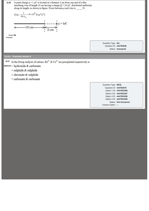 A point charge \(q = 1\,\muC\) is located at a distance \(2\,cm\) from one end of a thin insulating wire of length \(10\,cm\) having a charge \(Q = 24\,\muC\), distributed uniformly along its length, as shown in the figure. Force between \(q\) and wire is ____ N.