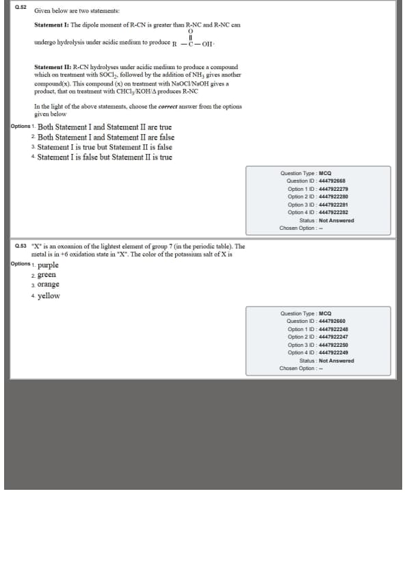 Statement I: The dipole moment of R–CN is greater than R–NC and R–NC can undergo hydrolysis under acidic medium to produce R–COOH.