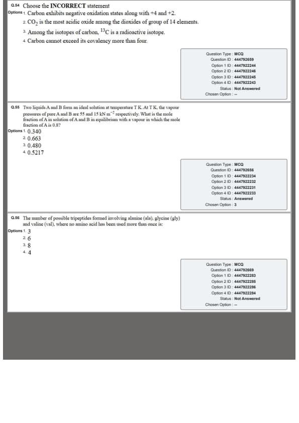 Two liquids A and B form an ideal solution at temperature T K. At T K, the vapour pressures of pure A and pure B are 55 and 15 kPa respectively. What is the mole fraction of A in solution of A and B in equilibrium with a vapour in which the mole fraction of A is 0.8?