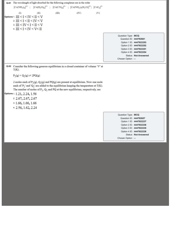 Initially, 2 moles each of P\(_2\)(g), Q\(_2\)(g) and PQ(g) are present at equilibrium. One mole each of P\(_2\) and Q\(_2\) are added. The number of moles of P\(_2\), Q\(_2\) and PQ at the new equilibrium respectively are