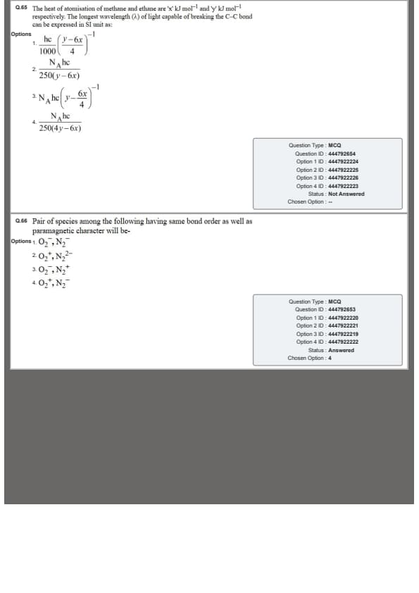 The heat of atomisation of methane and ethane are \(x\) kJ mol\(^{-1}\) and \(y\) kJ mol\(^{-1}\) respectively. The longest wavelength (\(\lambda\)) of light capable of breaking the C–C bond can be expressed in SI unit as: