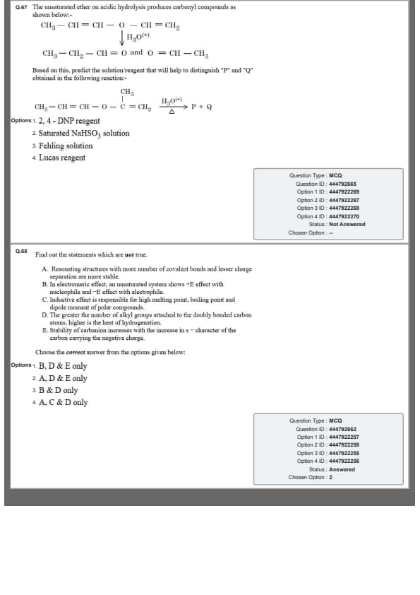 The unsaturated ether on acidic hydrolysis produces carbonyl compounds as shown below. Based on this, predict the solution/reagent that will help to distinguish "P" and "Q" obtained in the reaction.