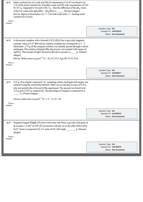 Molar conductivity of a weak acid HQ of concentration 0.18 M was found to be \(\dfrac{1}{30}\) of the molar conductivity of another weak acid HZ with concentration 0.02 M. If \(\alpha_Q\) happened to be equal with \(\alpha_Z\), then the difference of the pK\(_a\) values of the two weak acids (pK\(_a\)(HQ) – pK\(_a\)(HZ)) is \underline{\hspace{1cm (Nearest integer).