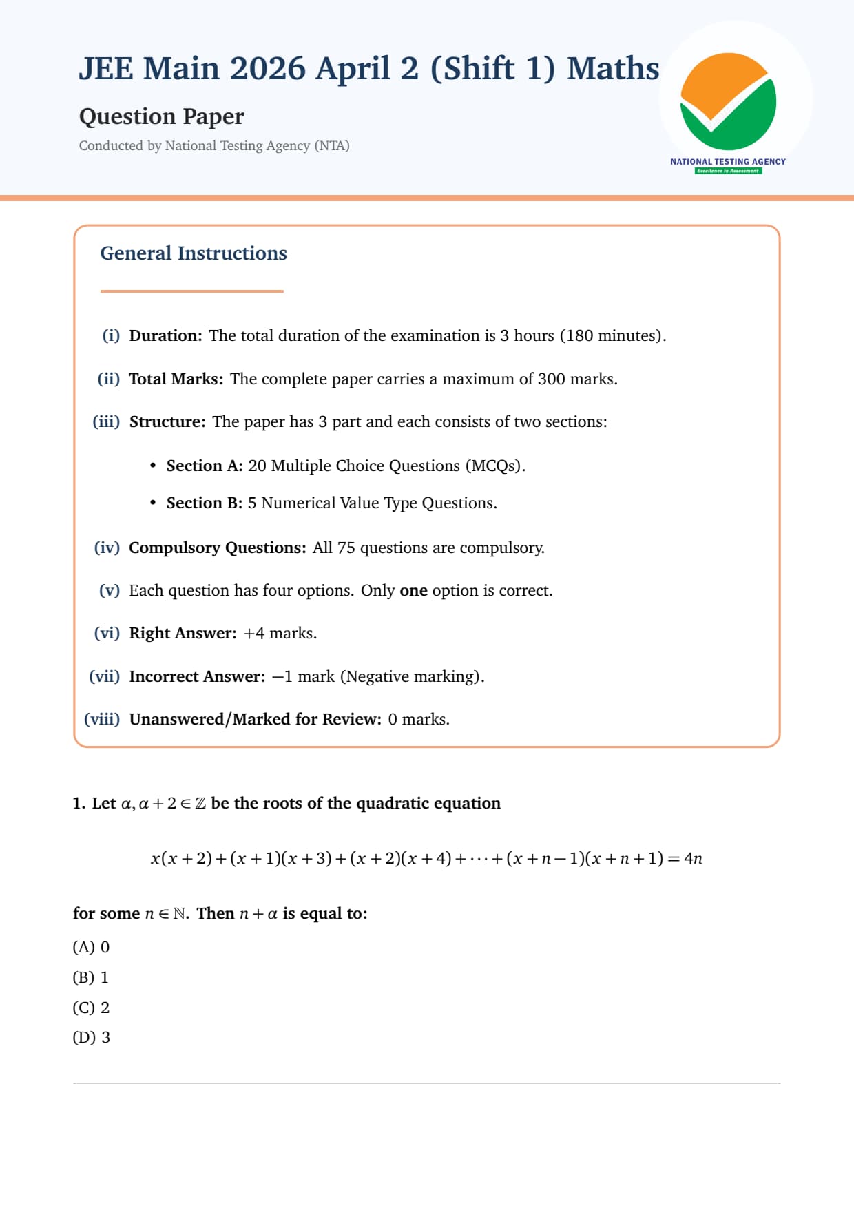 Candidates can download the JEE Main 2026 April 2 Shift 1 mathematics question paper along with detailed solutions to analyze their performance and understand the exam pattern better.