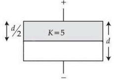 A parallel plate air capacitor has a capacitance \(C\). When it is half filled as shown in the figure with a dielectric constant \(K=5\), the percentage increase in the capacitance is: