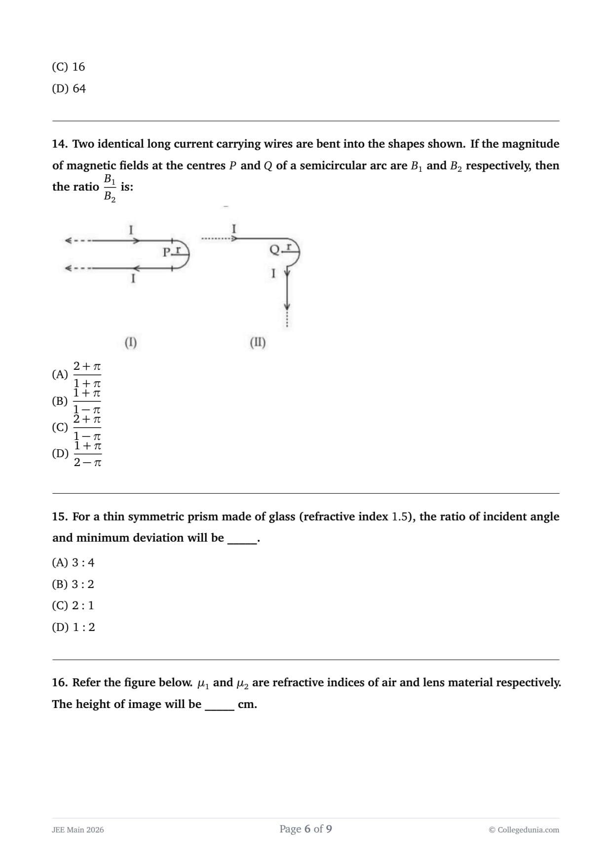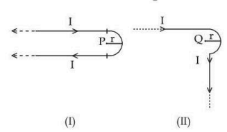 Two identical long current carrying wires are bent into the shapes shown. If the magnitude of magnetic fields at the centres \(P\) and \(Q\) of a semicircular arc are \(B_1\) and \(B_2\) respectively, then the ratio \( \dfrac{B_1}{B_2} \) is: