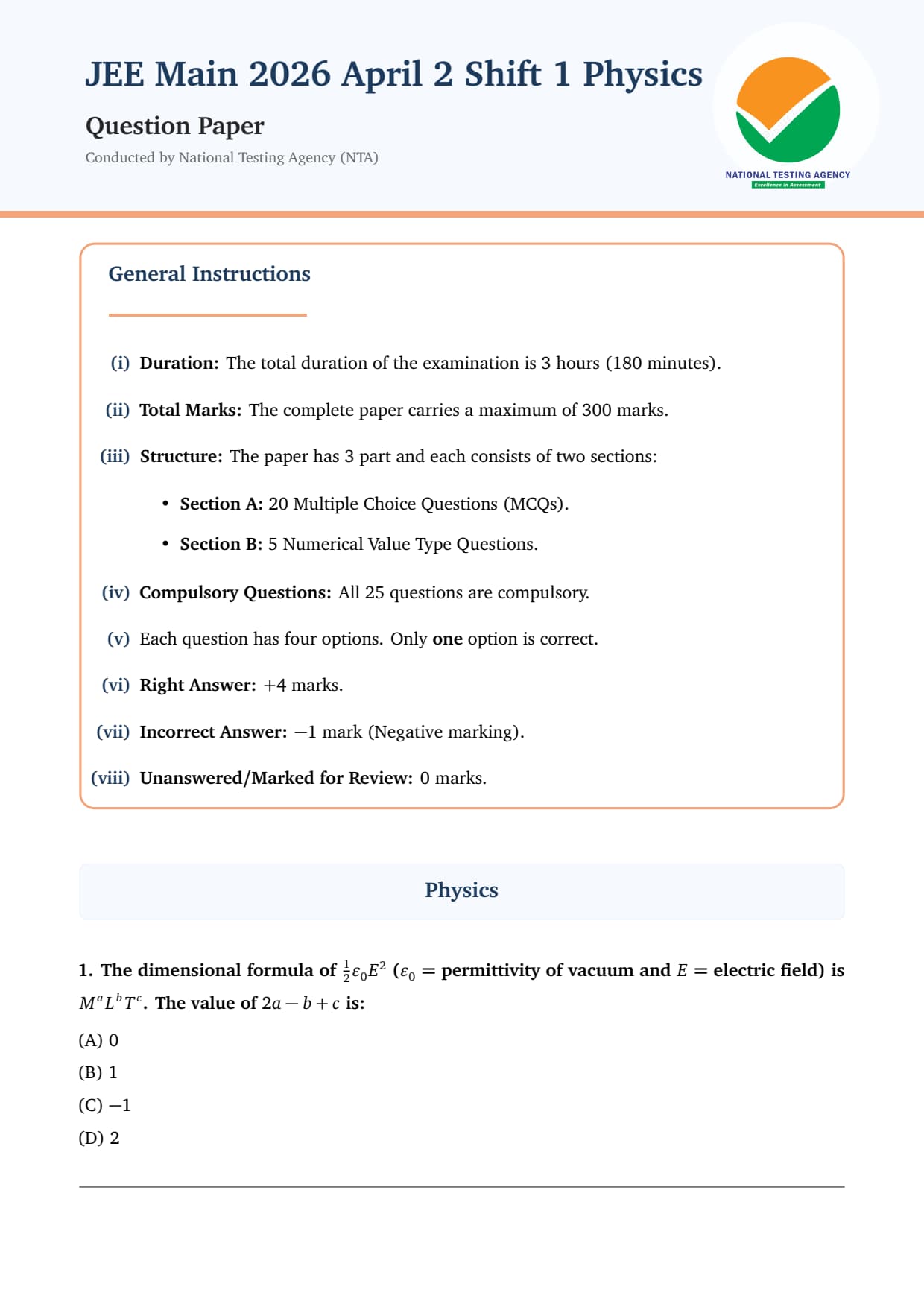 Candidates can download the JEE Main 2026 April 2 Shift 1 physics question paper along with detailed solutions to analyze their performance and understand the exam pattern better.