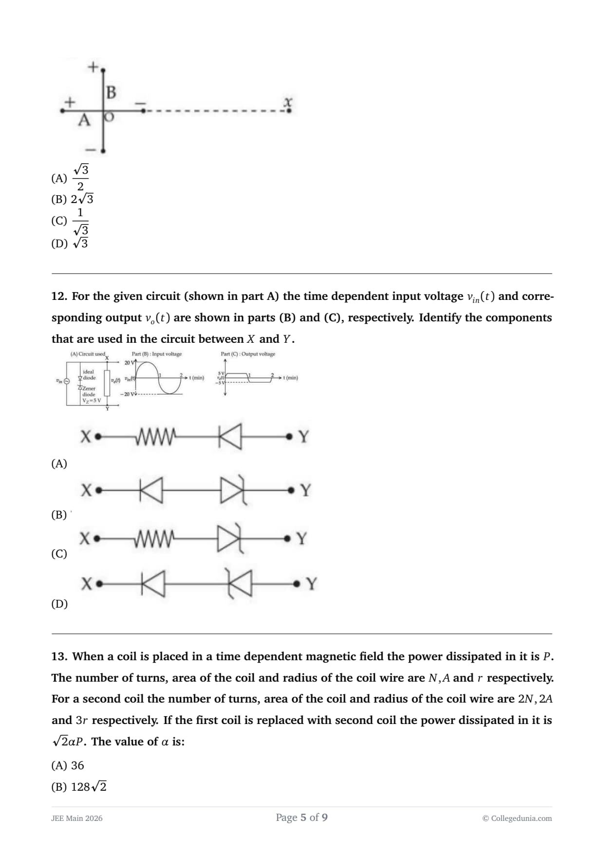 When a coil is placed in a time dependent magnetic field the power dissipated in it is \(P\). The number of turns, area of the coil and radius of the coil wire are \(N, A\) and \(r\) respectively. For a second coil the number of turns, area of the coil and radius of the coil wire are \(2N, 2A\) and \(3r\) respectively. If the first coil is replaced with second coil the power dissipated in it is \(\sqrt{2}\alpha P\). The value of \(\alpha\) is: