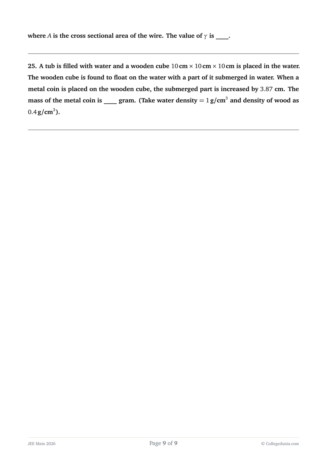 A tub is filled with water and a wooden cube \(10\,cm \times 10\,cm \times 10\,cm\) is placed in the water. The wooden cube is found to float on the water with a part of it submerged in water. When a metal coin is placed on the wooden cube, the submerged part is increased by \(3.87\) cm. The mass of the metal coin is ____ gram. (Take water density \(=1\,g/cm^3\) and density of wood as \(0.4\,g/cm^3\)).