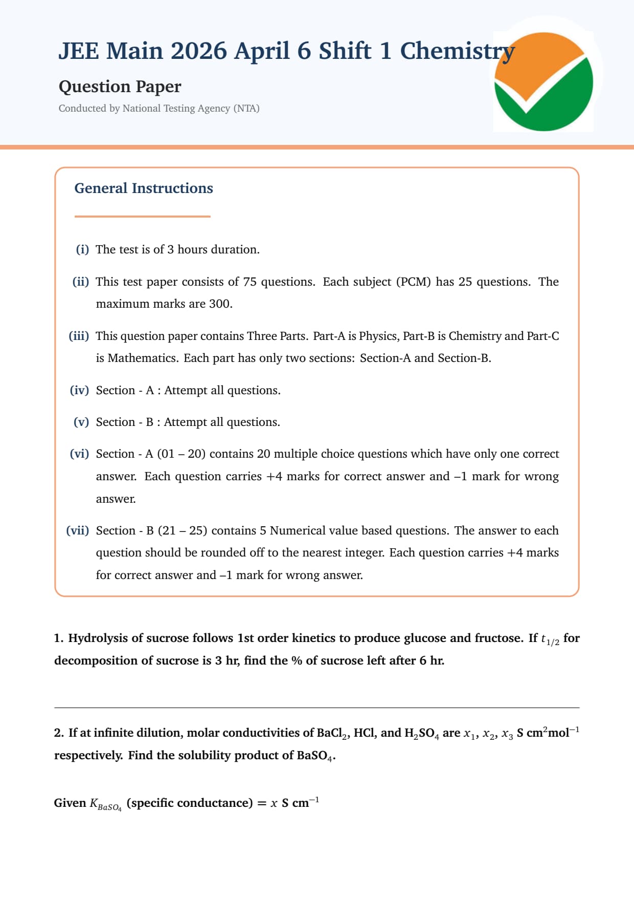 Candidates can download the JEE Main 2026 April 6 Shift 1 chemistry question paper along with detailed solutions to analyze their performance and understand the exam pattern better.