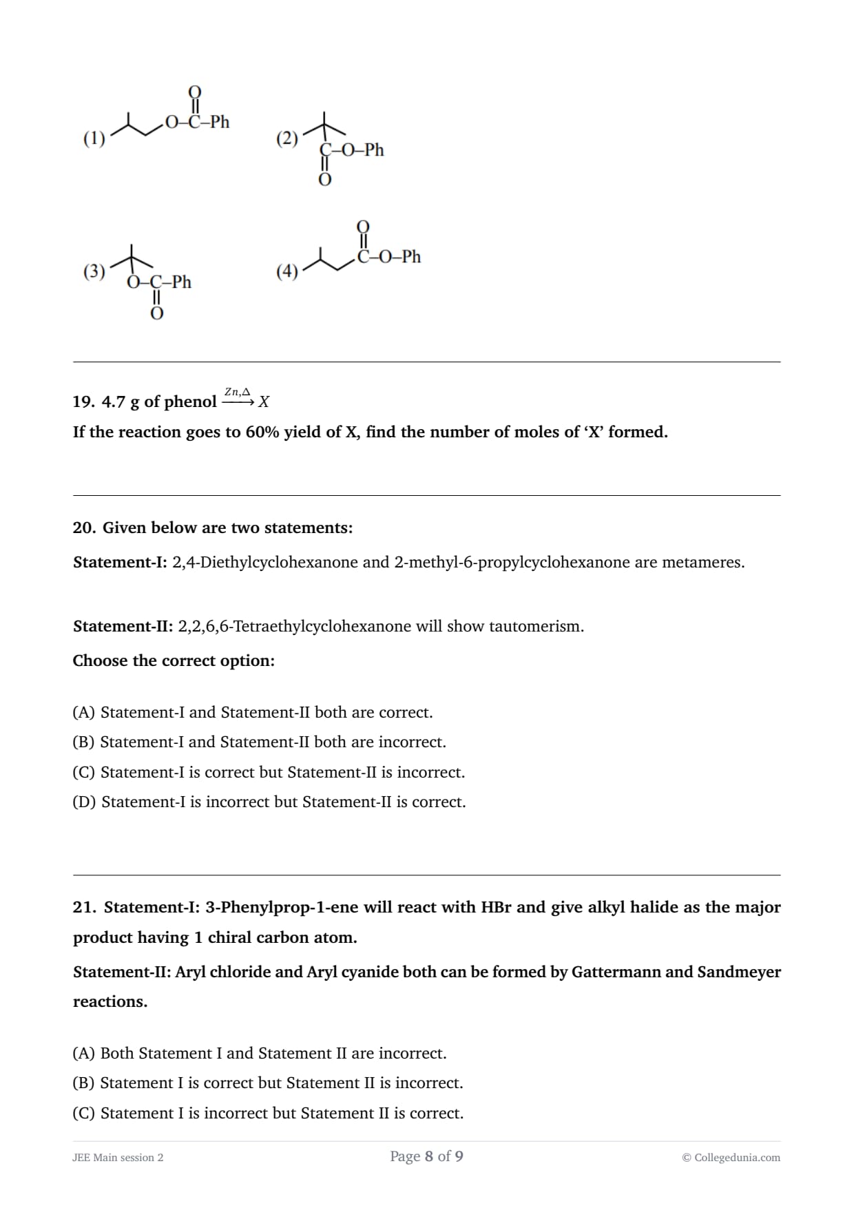 Statement-I: 2,4-Diethylcyclohexanone and 2-methyl-6-propylcyclohexanone are metameres.