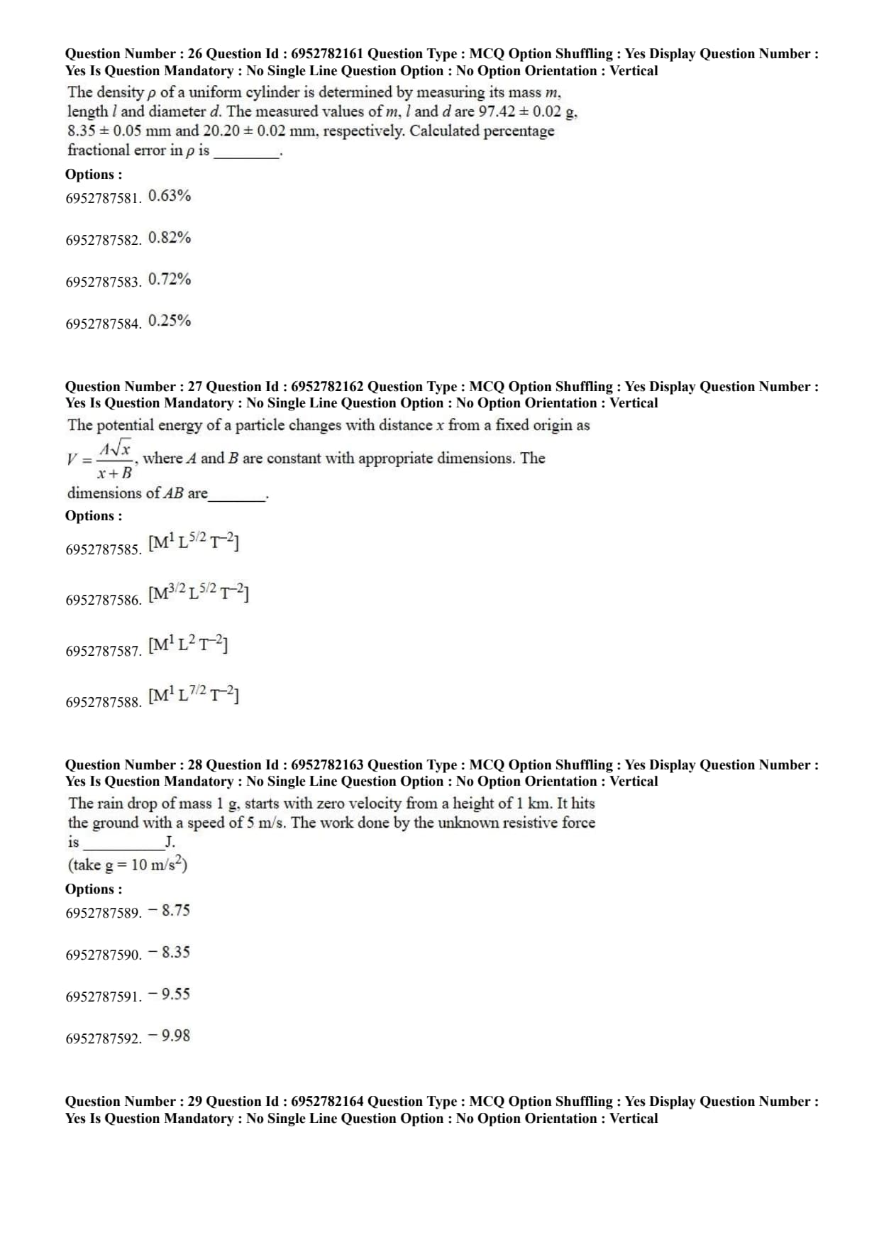 The density $\rho$ of a uniform cylinder is determined by measuring its mass $m$, length $l$ and diameter $d$. The measured values of $m, l$ and $d$ are $97.42 \pm 0.02$ g, $8.35 \pm 0.05$ mm and $20.20 \pm 0.02$ mm, respectively. Calculated percentage fractional error in $\rho$ is