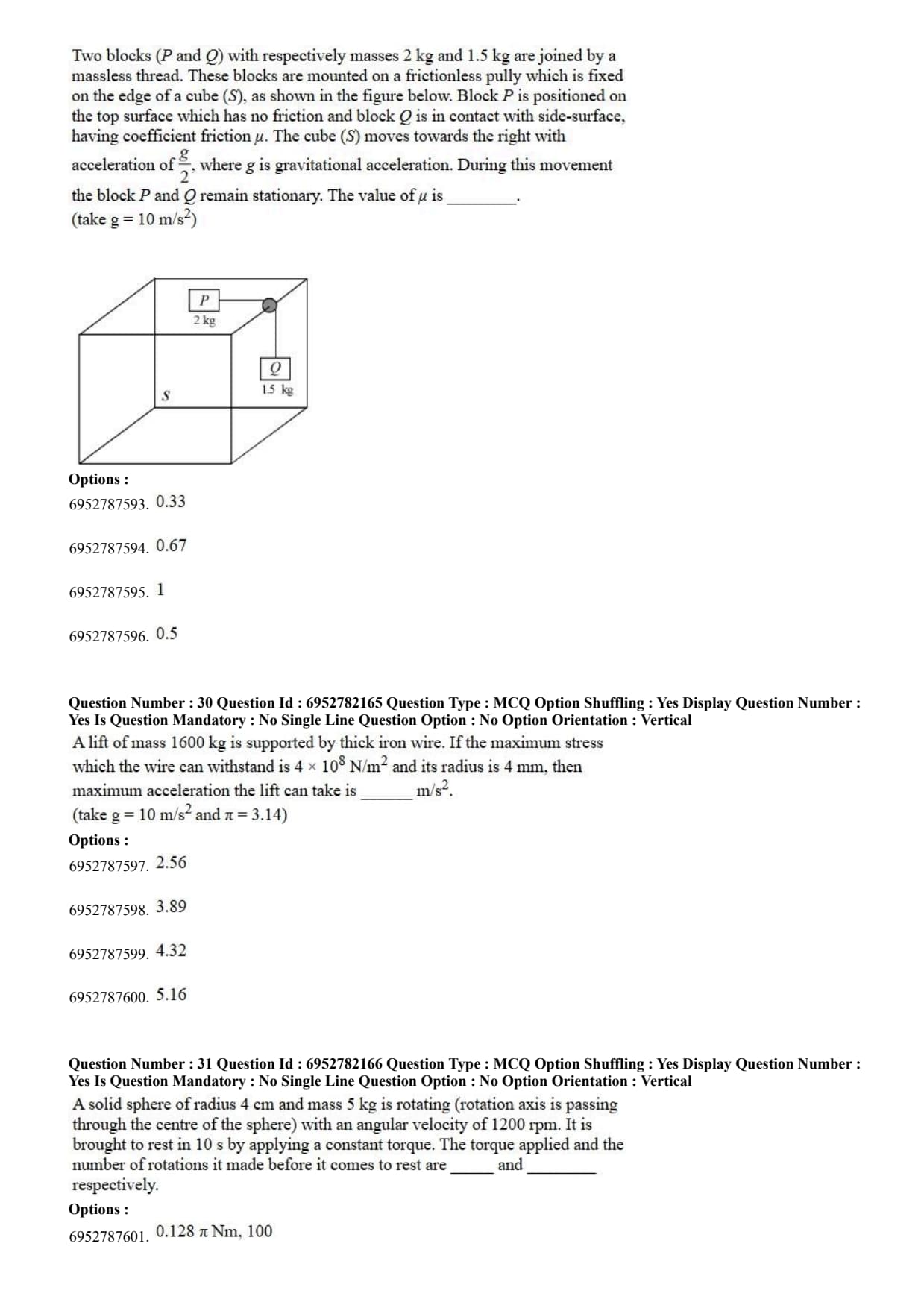 Two blocks ($P$ and $Q$) with respectively masses $2\text{ kg}$ and $1.5\text{ kg}$ are joined by a massless thread. These blocks are mounted on a frictionless pully which is fixed on the edge of a cube $(S)$, as shown in the figure below. Block $P$ is positioned on the top surface which has no friction and block $Q$ is in contact with side-surface, having coefficient friction $\mu$. The cube $(S)$ moves towards the right with acceleration of $\frac{g}{2}$, where $g$ is gravitational acceleration. During this movement the block $P$ and $Q$ remain stationary. The value of $\mu$ is ______. (take $g = 10\text{ m/s}^2$)