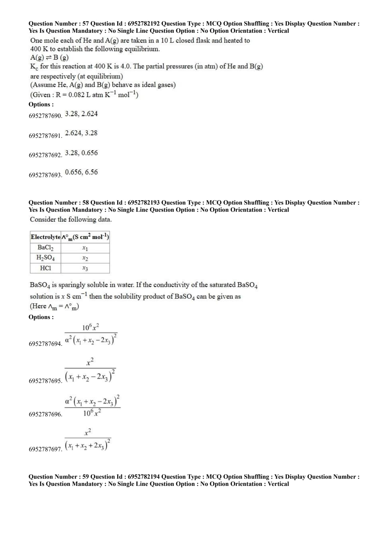 $$\begin{array}{|c|c|} \hline \text{Electrolyte} & \Lambda_m^\circ (\text{S cm}^2 \text{ mol}^{-1}) \\ \hline \text{BaCl}_2 & x_1 \\ \hline \text{H}_2\text{SO}_4 & x_2 \\ \hline \text{HCl} & x_3 \\ \hline \end{array}$$