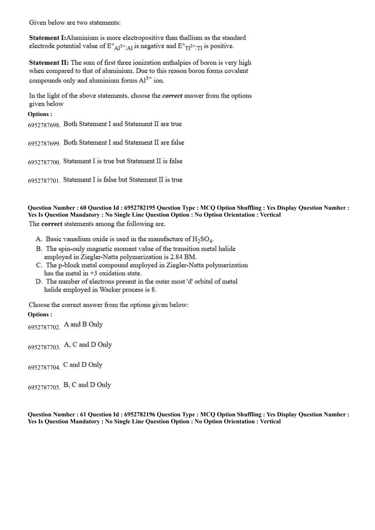 Statement I: Aluminium is more electropositive than thallium as the standard electrode potential value of $E^\circ_{Al^{3+}/Al}$ is negative and $E^\circ_{Tl^{3+}/Tl}$ is positive.