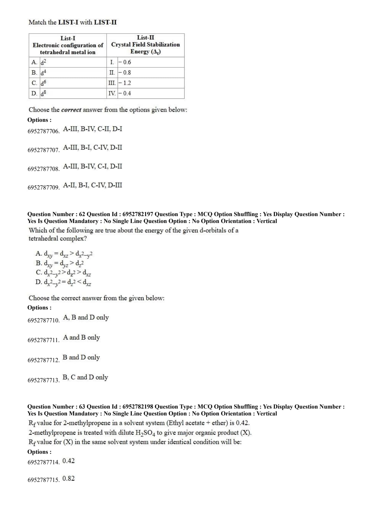 $$\begin{array}{|l|l|} \hline \textbf{List-I (Electronic configuration of tetrahedral metal ion)} & \textbf{List-II (Crystal Field Stabilization Energy (\Delta_t))} \\ \hline \text{A. } d^2 & \text{I. } -0.6 \\ \hline \text{B. } d^4 & \text{II. } -0.8 \\ \hline \text{C. } d^6 & \text{III. } -1.2 \\ \hline \text{D. } d^8 & \text{IV. } -0.4 \\ \hline \end{array}$$