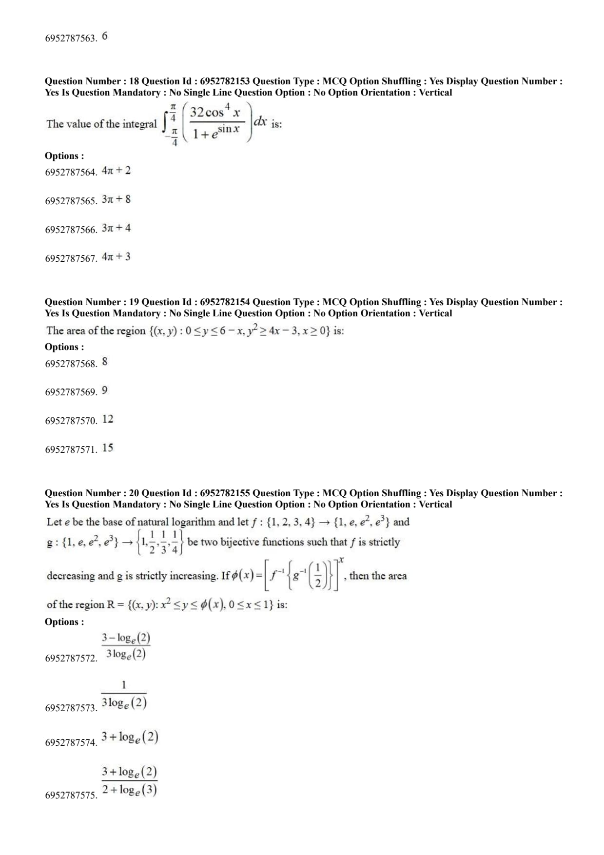 Let $e$ be the base of natural logarithm and let $f : \{1, 2, 3, 4\} \to \{1, e, e^2, e^3\}$ and $g : \{1, e, e^2, e^3\} \to \{1, \frac{1}{2}, \frac{1}{3}, \frac{1}{4}\}$ be two bijective functions such that $f$ is strictly decreasing and $g$ is strictly increasing. If $\phi(x) = \left[ f^{-1} \left\{ g^{-1} \left( \frac{1}{2} \right) \right\} \right]^x$, then the area of the region $R = \{ (x, y) : x^2 \le y \le \phi(x), 0 \le x \le 1 \}$ is:
