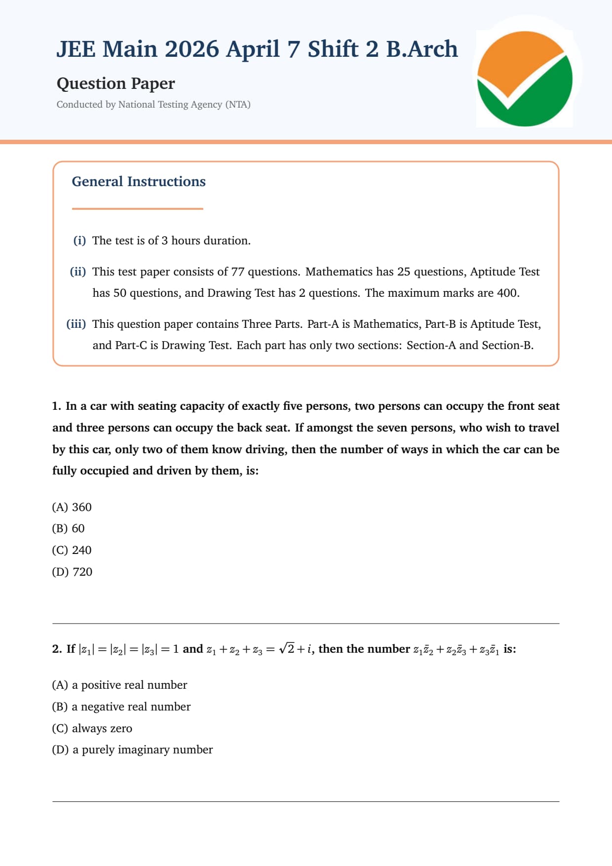 NTA conducted JEE Main 2026 April 7 Shift 2 B.Arch Paper from 3 PM to 6 PM in 3 sections: Mathematics, Aptitude Test in CBT mode, and Drawing Test in Pen and Paper-based mode, prepared according to the latest JEE Main exam pattern.