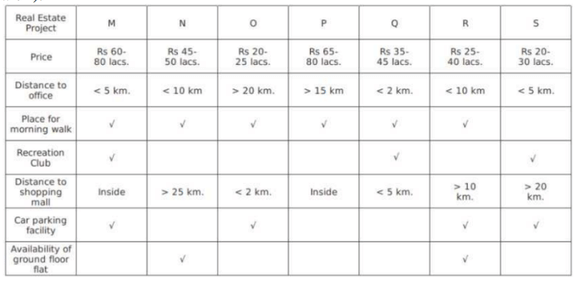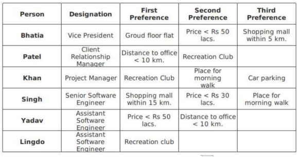 Analyse the following caselet and answer the questions that follow: Six people working at the Bengaluru office of Simsys are planning to buy flats at a real estate project at Whitefield. Their preferences are listed below:
