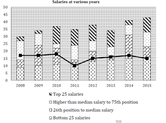 This graph depicts the last eight years’ annual salaries (in Rs. lacs.) offered to student during campus placement. Every year 100 students go through placement process. However, at least one of them fails to get placed. The salaries of all unplaced students are marked zero and represented in the graph.