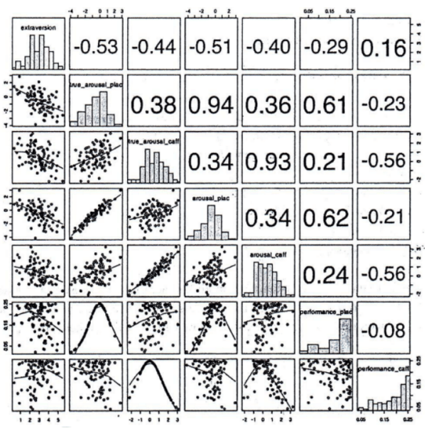 The grid below captures relationships among seven personality dimensions: “extraversion”, “true arousal plac”, “true arousal caff”, “arousal plac”, “arousal caff”, “performance plac”, and “performance caff”. The diagonal represents histograms of the seven dimensions. Left of the diagonal represents scatterplots between the dimensions while the right of the diagonal represents quantitative relationships between the dimensions. The lines in the scatterplots are closest approximation of the points. The value of the relationships to the right of the diagonal can vary from -1 to +1, with -1 being the extreme linear negative relation and +1 extreme linear positive relation. (Axes of the graph are conventionally drawn).