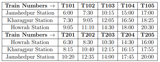 A courier service has offices at three locations: Jamshedpur, Kharagpur and Howrah. Its employees travel by trains from one location to another for pickup and delivery. It takes 40 minutes for an employee to travel from any railway station to the nearest office (and another 40 minutes for coming back); the paperwork to deliver the parcel at the respective office takes an additional 10 minutes. Assume employees do not waste any time.