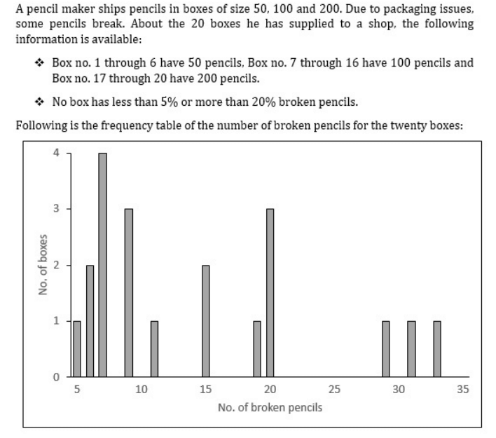 Suppose that additionally it is known that the number of broken pencils in Boxes 17-20 are in an increasing order. Which among the following additional information, if true, is not sufficient to uniquely know the number of defective pencils in each of the boxes numbered 17-20?