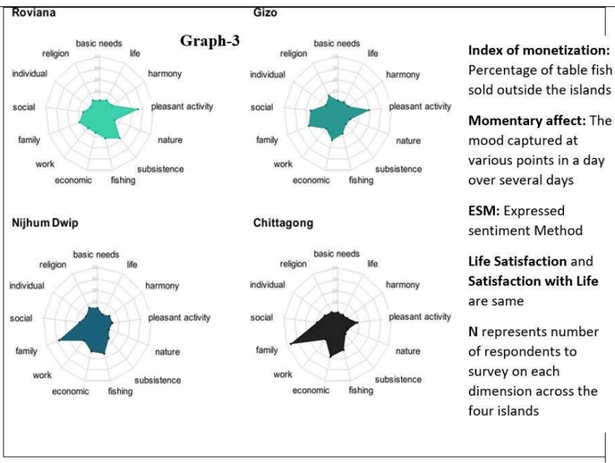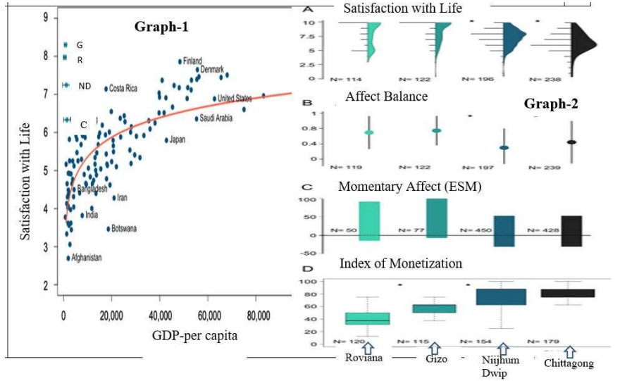 The three graphs below capture relationship between economic (and social) activities and subjective well–being. The first graph (Graph–1) captures relationship between GDP (per–capita) and Satisfaction with life, across different countries and four islands: Gizo, Roviana, Nijhum Dwip, and Chittagong. The Graph–2 captures three different measures of subjective well–being (Satisfaction with life, Affect Balance and Momentary Affect) across the four islands, which have different levels monetization (Index). The Graph–3 captures levels of thirteen different socio–economic activities across four islands.