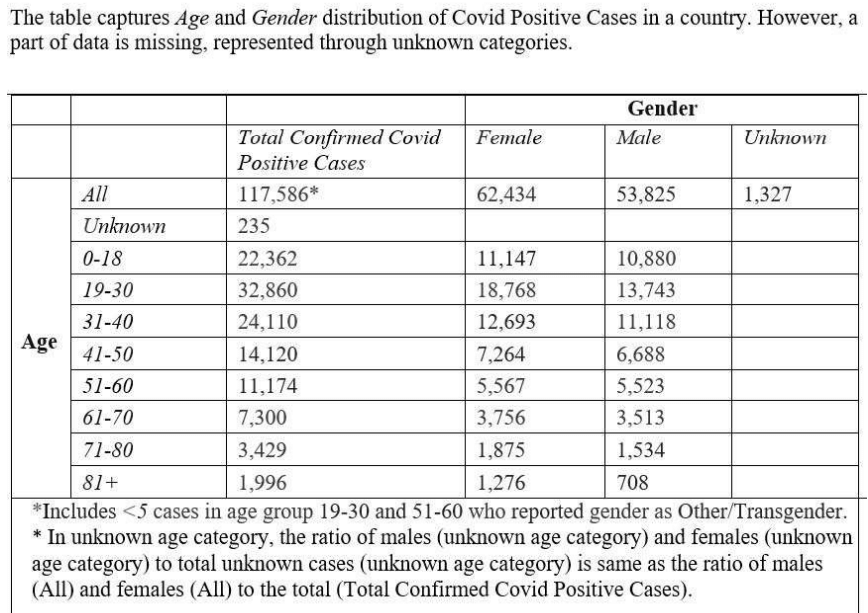 In unknown age category, the ratio of males (unknown age category) and females (unknown age category) to total unknown cases (unknown age category) is same as the ratio of males (All) and females (All) to the total (total confirmed covid positive cases). How many females were in the unknown age category (rounded to nearest integer)?