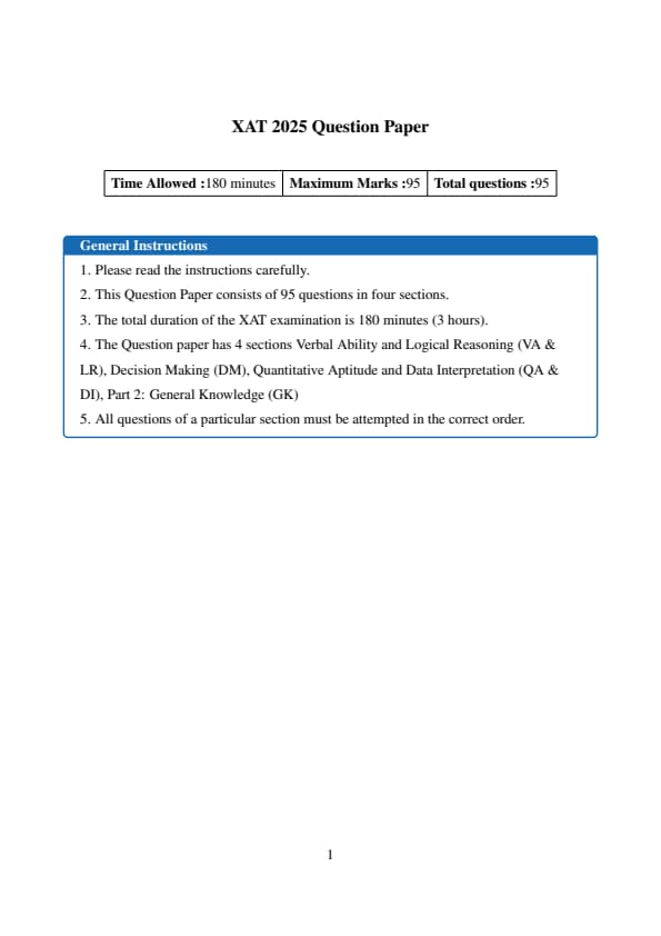 XAT 2025 Question paper with Answer key and Solution PDF for the exam conducted on January 5, 2025 is available here. The exam is conducted by XLRI Jamshedpur in one shift from 2:00 PM to 5:30 PM. XAT question paper 2025 comprises total 100 MCQs (28 in QADI, 26 in VALR, 21 in DM, and 25 in GK) and 1 essay.