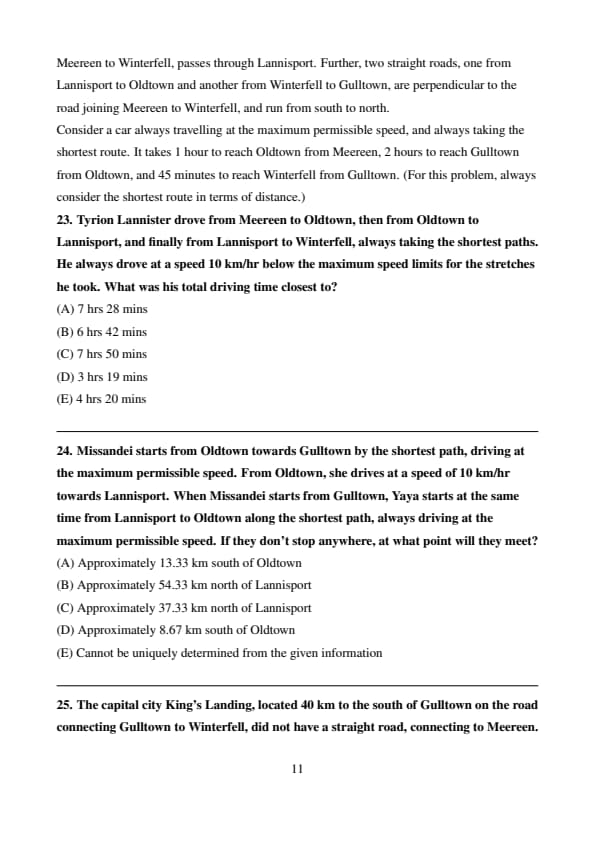 The diagram below represents a road network connecting five towns, namely Meereen, Lannisport, Winterfell, Oldtown, and Gulltown. The maximum speed limits along any stretch of road are as shown in the diagram. The straight road that connects Meereen to Gulltown passes through Oldtown. Another straight road, running west to east, connecting Meereen to Winterfell, passes through Lannisport. Further, two straight roads, one from Lannisport to Oldtown and another from Winterfell to Gulltown, are perpendicular to the road joining Meereen to Winterfell, and run from south to north. Consider a car always travelling at the maximum permissible speed, and always taking the shortest route. It takes 1 hour to reach Oldtown from Meereen, 2 hours to reach Gulltown from Oldtown, and 45 minutes to reach Winterfell from Gulltown. (For this problem, always consider the shortest route in terms of distance.)