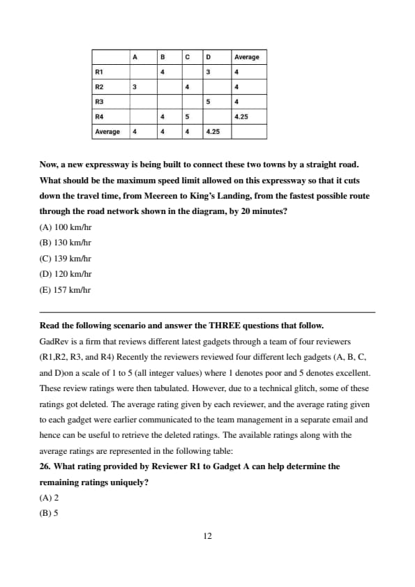 GadRev is a firm that reviews different latest gadgets through a team of four reviewers (R1,R2, R3, and R4) Recently the reviewers reviewed four different lech gadgets (A, B, C, and D)on a scale of 1 to 5 (all integer values) where 1 denotes poor and 5 denotes excellent. These review ratings were then tabulated. However, due to a technical glitch, some of these ratings got deleted. The average rating given by each reviewer, and the average rating given to each gadget were earlier communicated to the team management in a separate email and hence can be useful to retrieve the deleted ratings. The available ratings along with the average ratings are represented in the following table: