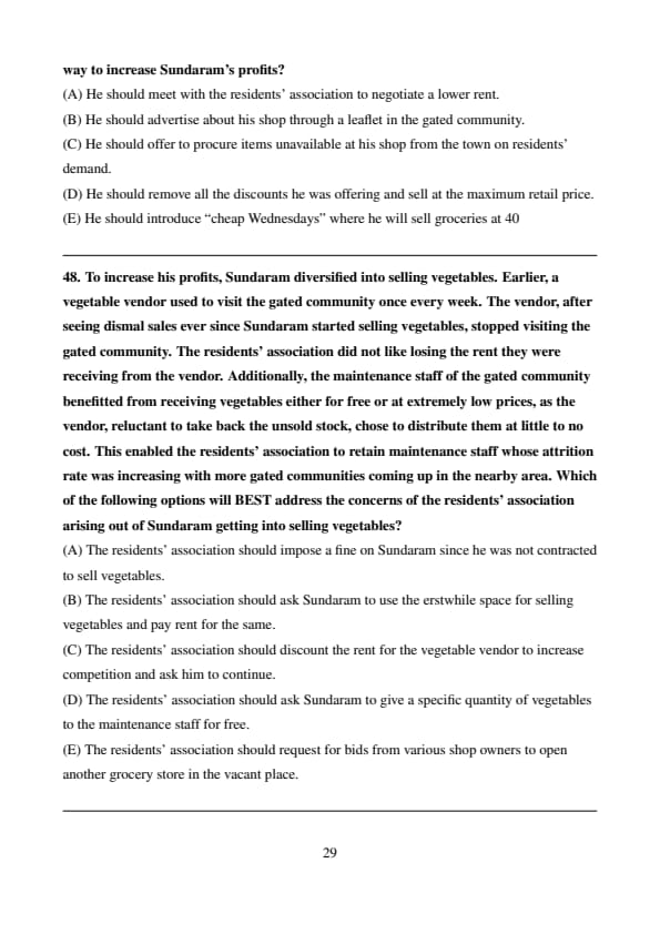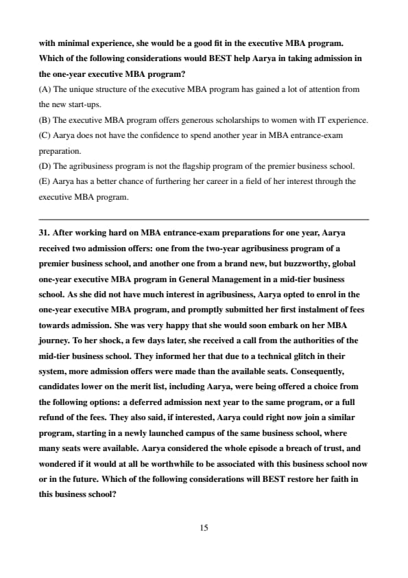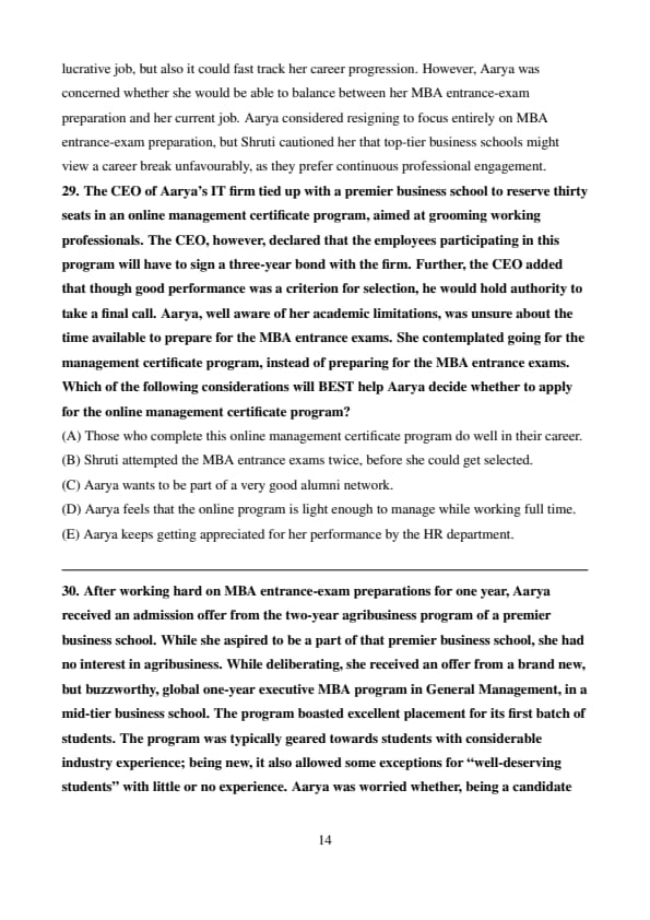 Shruti appreciated Aarya’s aspirations, telling her that doing MBA from a top-tier business school could not only land Aarya a lucrative job, but also it could fast track her career progression. However, Aarya was concerned whether she would be able to balance between her MBA entrance-exam preparation and her current job. Aarya considered resigning to focus entirely on MBA entrance-exam preparation, but Shruti cautioned her that top-tier business schools might view a career break unfavourably, as they prefer continuous professional engagement.Question 29: